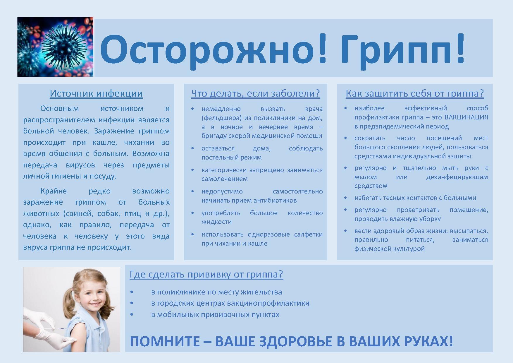 Грипп – острая респираторная инфекция, вызываемая вирусом гриппа и поражающая в первую очередь верхние дыхательные пути, иногда бронхи и даже легкие. Выделяют четыре вируса гриппа: А, В, С, D. Вирус гриппа типа А, в свою очередь, делится на подтипы в соответствии с комбинациями белков на поверхности вируса. В настоящее время среди людей циркулируют вирусы гриппа подтипов A(H1N1) и A(H3N2).