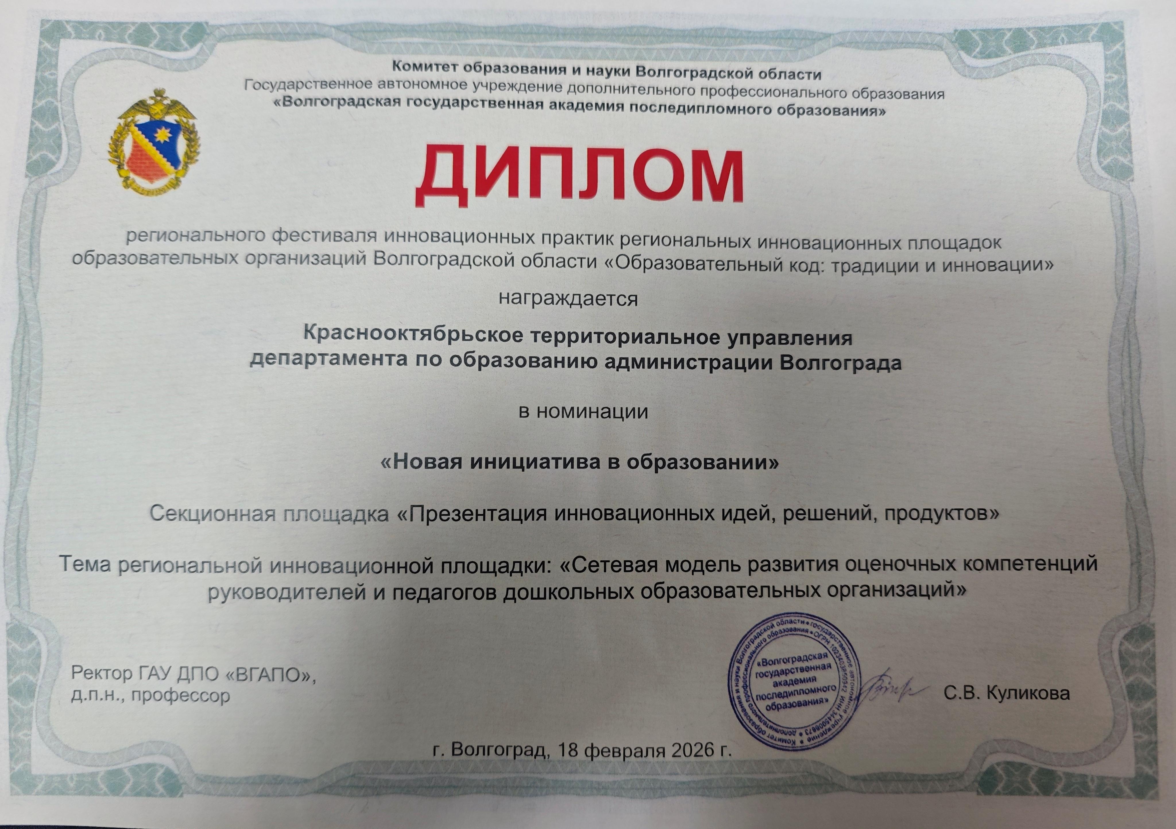 Региональная инновационная площадка Краснооктябрьского территориального управления департамента по образованию администрации Волгограда "Сетевая модель развития оценочных компетенций руководителей и педагогов дошкольных образовательных организаций" (2024-2028гг)